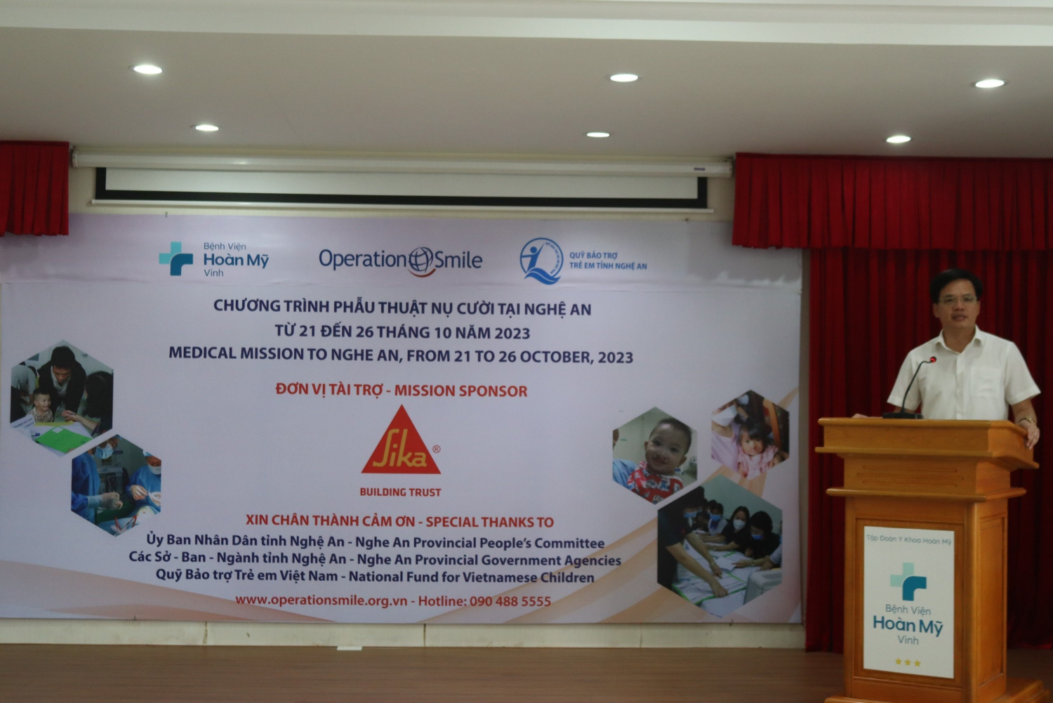 Phát biểu tại lễ khai mạc, đồng chí Bùi Văn Hưng – Phó Giám đốc Sở Lao động – Thương binh và Xã hội ghi nhận những đóng góp tích cực, hiệu quả của Tổ chức Operation Smile Việt Nam và các nhà tài trợ đã có những hoạt động nhân đạo ý nghĩa, mang tính nhân văn sâu sắc nhằm đem lại nụ cười mới cho các trẻ dị tật khe hở môi và hở hàm ếch của tỉnh Nghệ An và một số tỉnh khu vực miền Trung. Đồng thời, đồng chí cũng mong muốn trong thời gian tới Tổ chức còn có nhiều chương trình nhân đạo ý nghĩa dành cho trẻ em khuyết tật, trẻ em có hoàn cảnh đặc biệt khó khăn tỉnh Nghệ An.