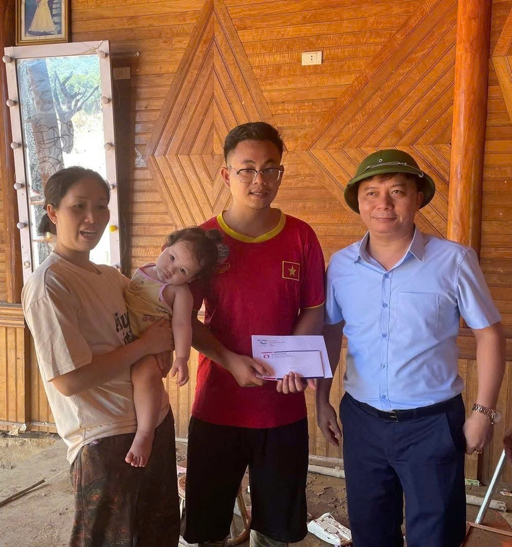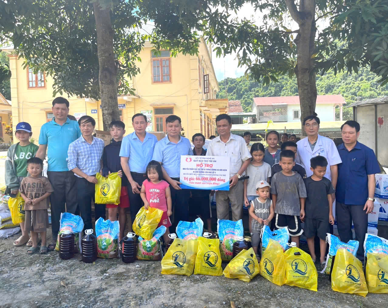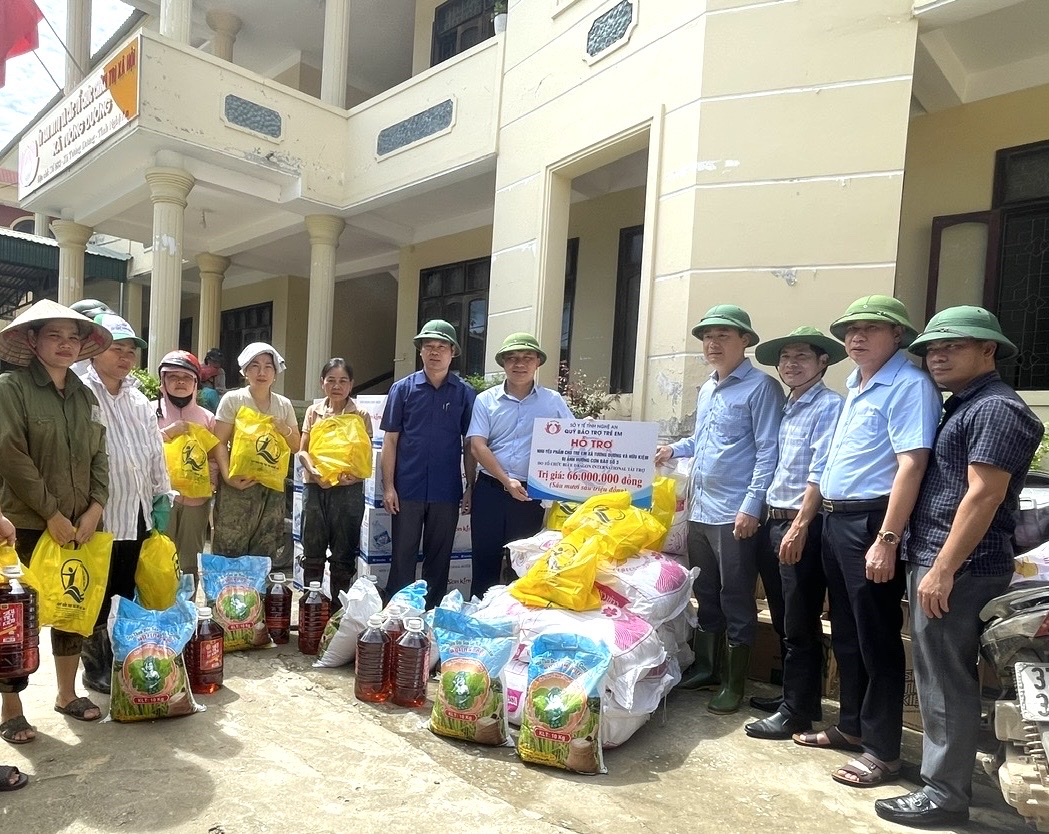 Đ/c Nguyễn Văn Nam – Phó Bí thư Đảng ủy, Phó Giám đốc Sở Y tế và đoàn trao tặng biển tài trợ tượng trưng và quà cho trẻ em bị ảnh hưởng bởi cơn bão số 3 tại xã Hữu Kiệm.