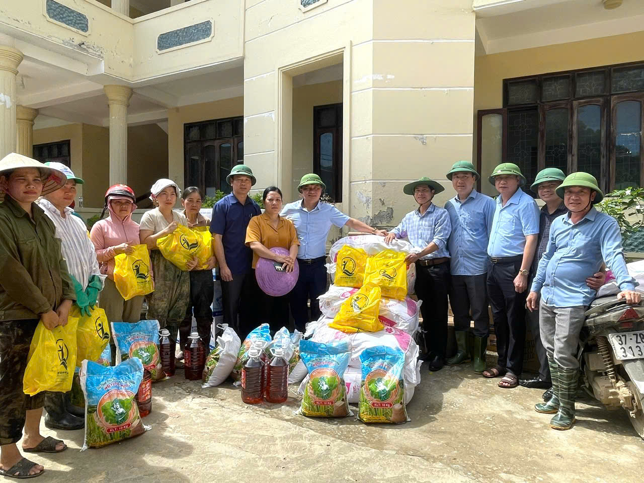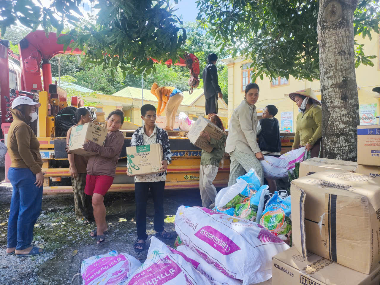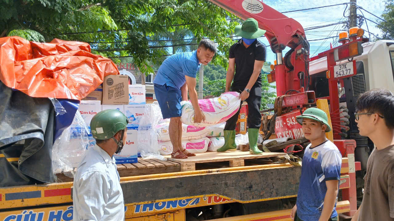 Đ/c Nguyễn Văn Nam – Phó Bí thư Đảng ủy, Phó Giám đốc Sở Y tế và đoàn trao tặng biển tài trợ tượng trưng và quà cho trẻ em bị ảnh hưởng bởi cơn bão số 3 tại xã Hữu Kiệm.