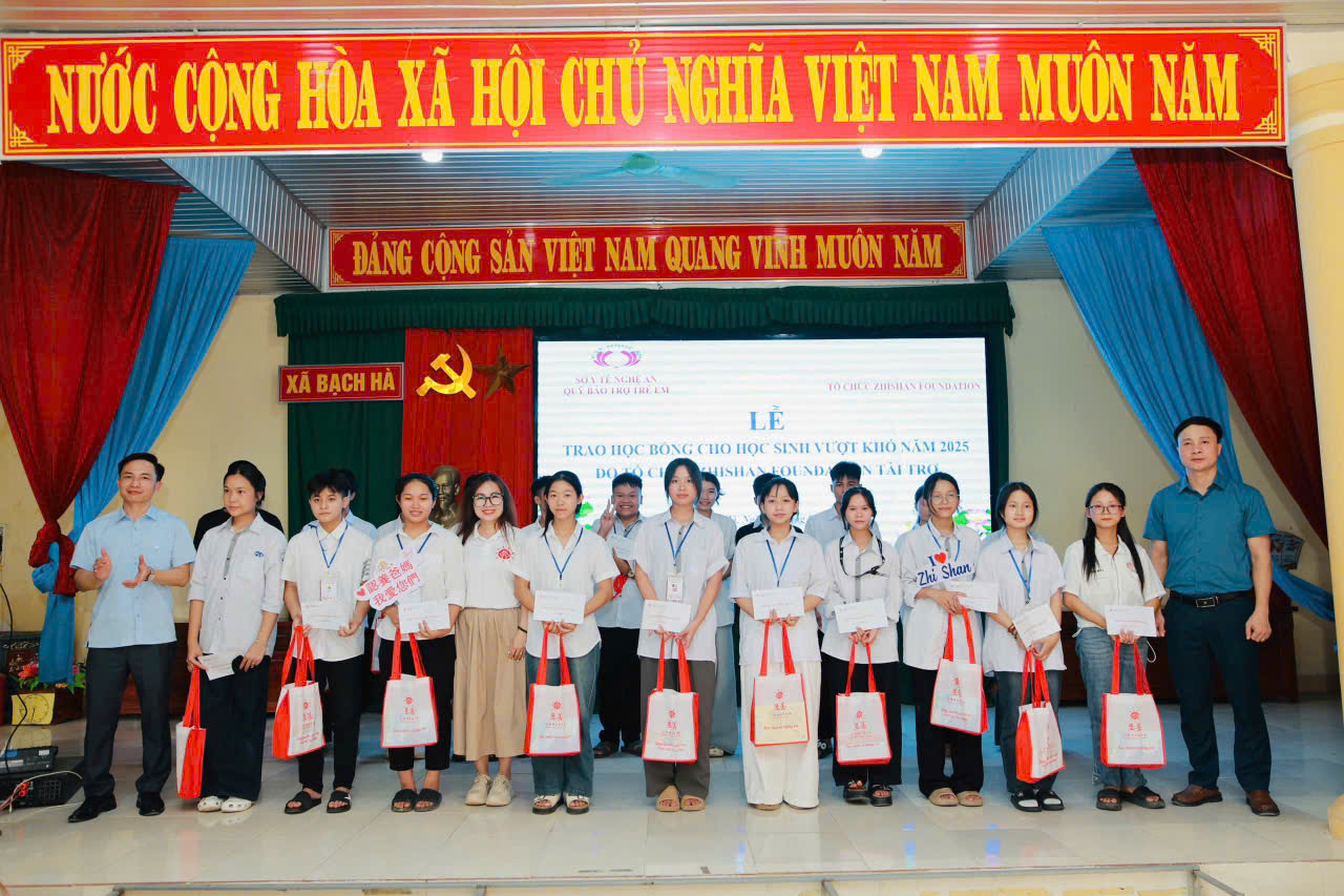 Đại biểu trao tặng học bổng và quà cho học sinh tại xã Bạch Hà