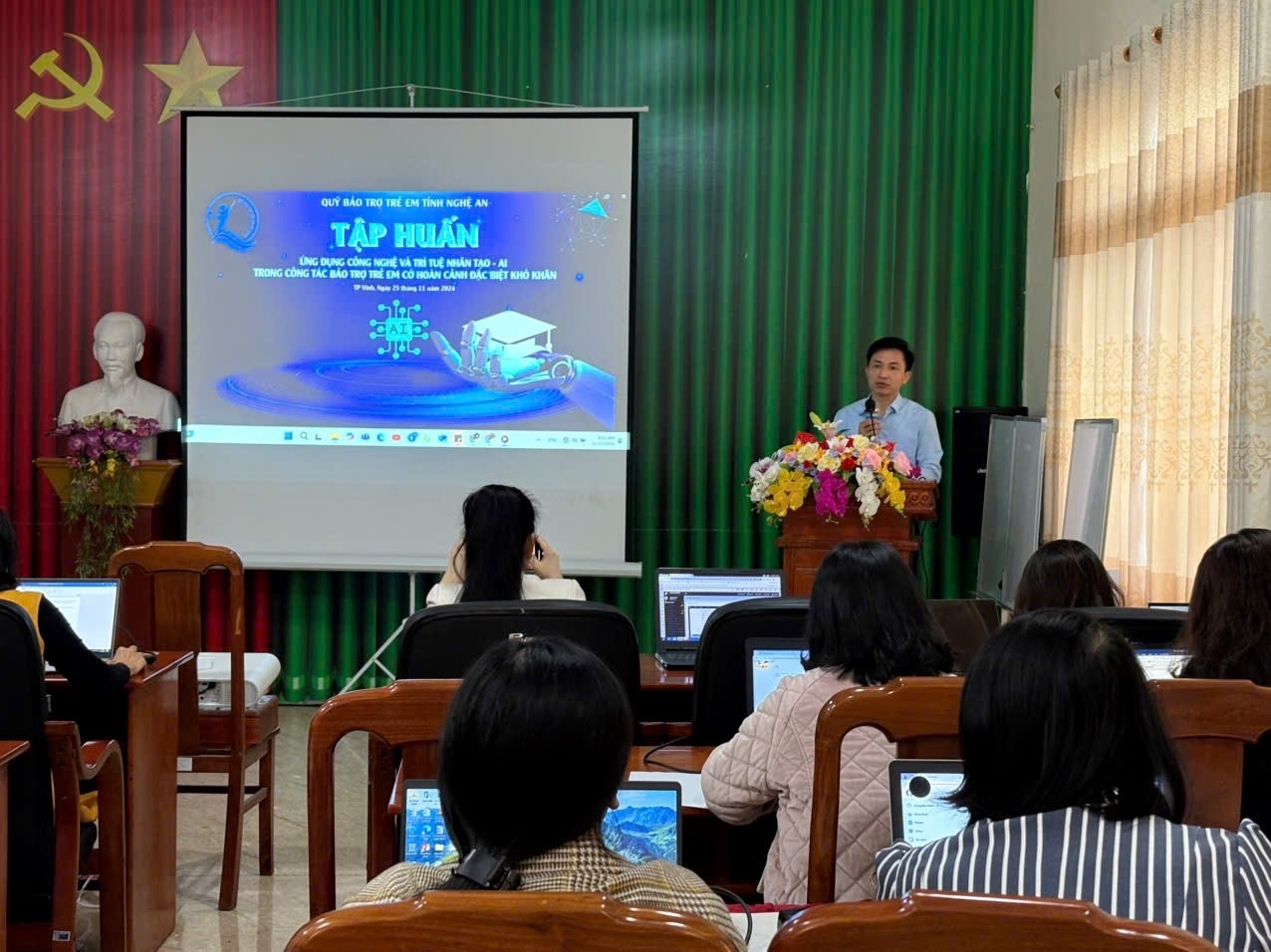Ngày 25/11/2024, Quỹ Bảo trợ trẻ em tỉnh Nghệ An tổ chức chương trình Tập huấn Ứng dụng Trí tuệ Nhân tạo trong Công tác với mục tiêu nâng cao nhận thức và trang bị các kỹ năng ứng dụng công nghệ AI cho cán bộ Quỹ Bảo trợ trẻ em và giáo viên tại các trung tâm chuyên biệt trên địa bàn tỉnh Nghệ An. Chương trình nhằm mục đích nâng cao hiệu quả công việc, cải thiện chất lượng dịch vụ, đồng thời phát triển tư duy sáng tạo trong việc ứng dụng AI vào giải quyết các vấn đề thực tiễn.