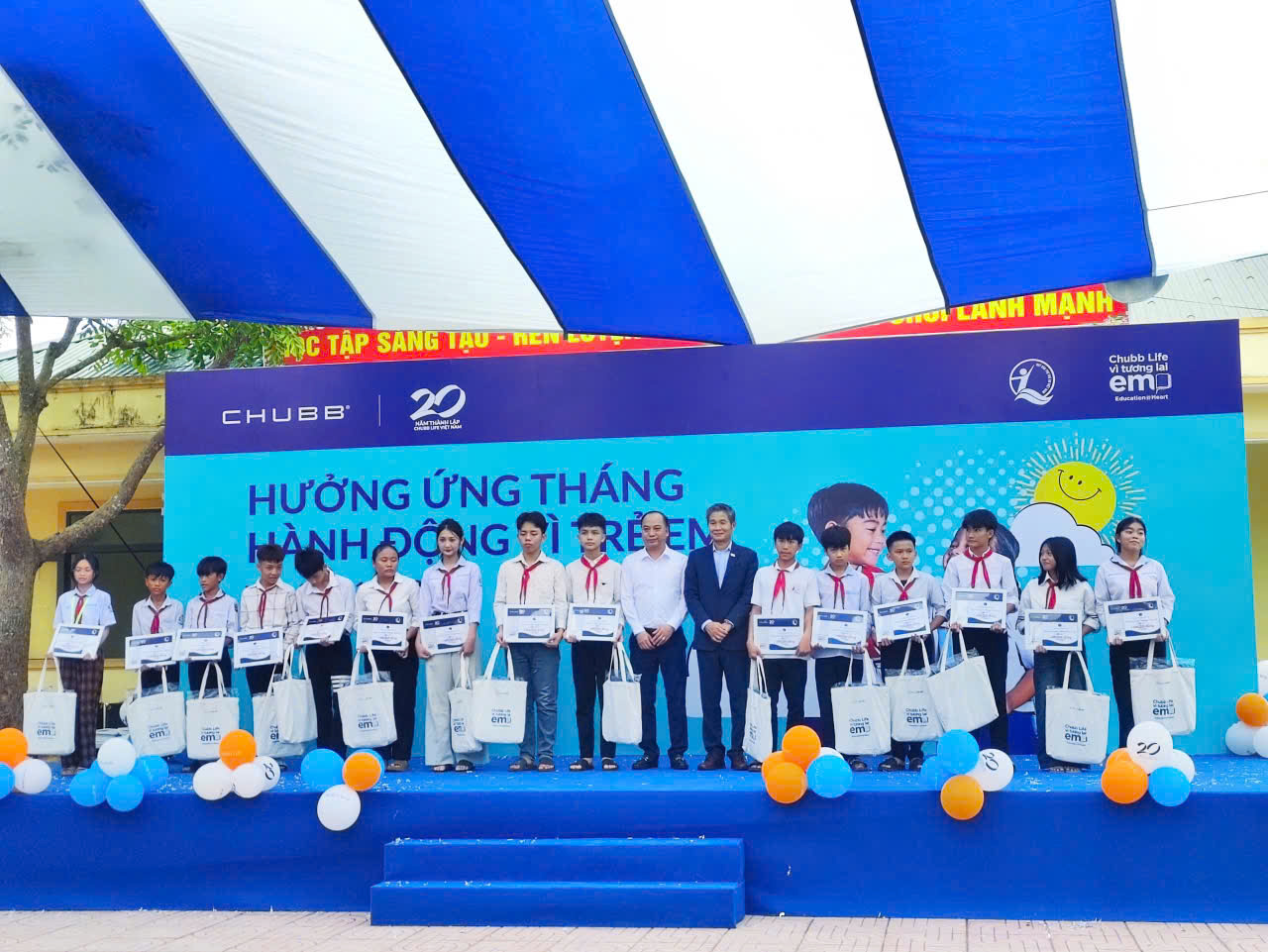 Đại diện Công ty TNHH Bảo hiểm Nhân thọ Chubb Life trao biển tài trợ tượng trưng cho Quỹ Bảo trợ trẻ em tỉnh Nghệ An dưới sự chứng kiến của Lãnh đạo Quỹ Bảo trợ trẻ em Việt Nam và đại diện Sở Y tế.